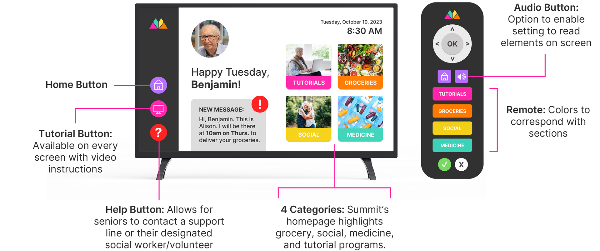 Includes the Smart TV app for seniors as well as mobile app for social workers and volunteers.