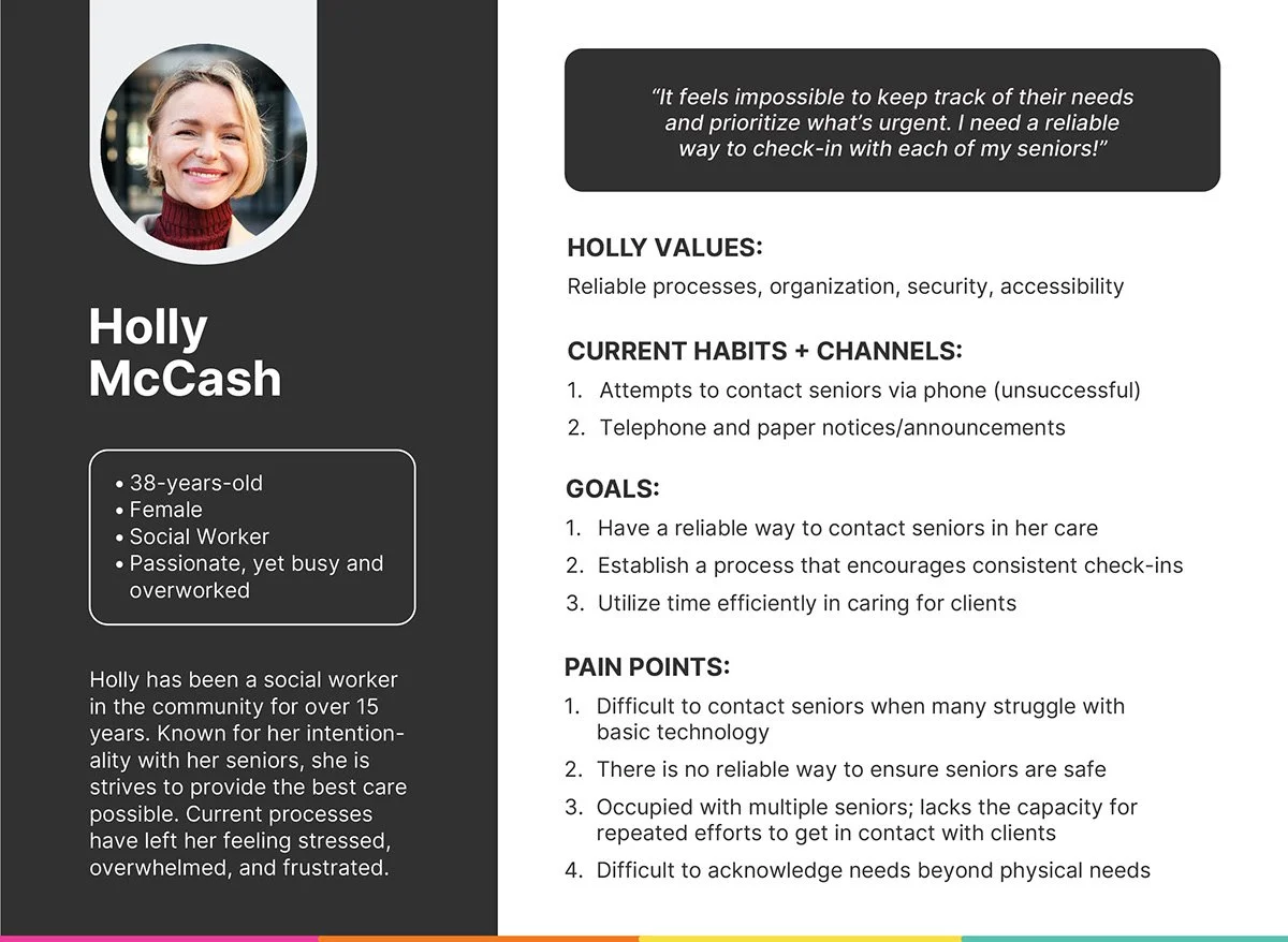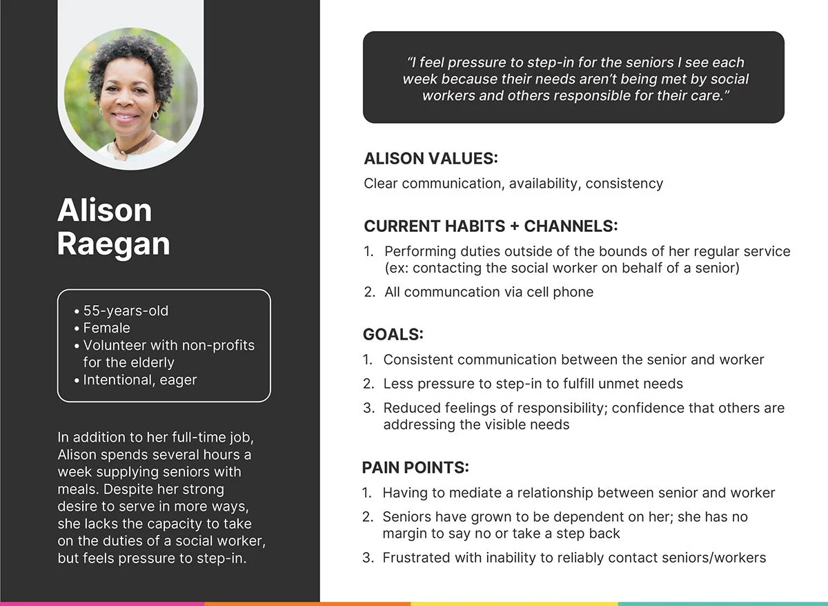 The three user personas below represent each of the 3 people groups that are currently affected: seniors, social workers, and secondary volunteers.