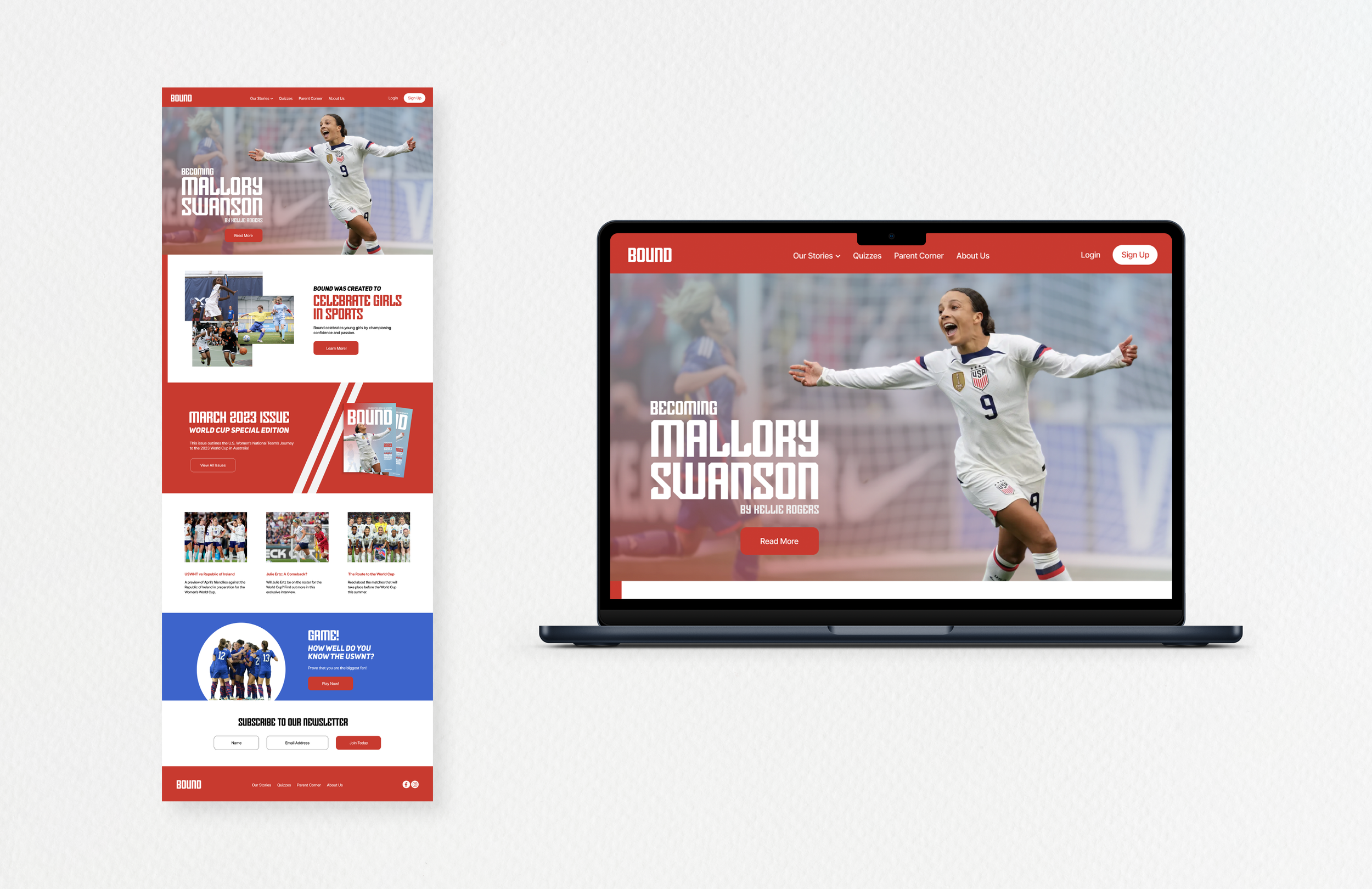 Bound Magazine was created to empower pre-teen girls by promoting positive role models and championing women in sports across the globe. Bound, meaning a leaping movement upward, was chosen to mirror the magazine's intent to encourage young girls to DREAM BIG. This issue focuses on the United States Women's National Soccer Team and their journey in the months prior to the 2023 Women's World Cup. Spotlighting rising star, Mallory Swanson, this issue tells her story in hope of connecting with young athletes across the country. Although most magazines for the pre-teen audience reflect a different aesthetic, Bound was created to stand out. Each page uses substantial photography and color to appeal to the pre-teen demographic and promote greater engagement.